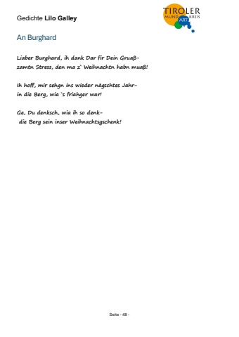 Gedichte Lilo Galley Seite - 48 - An Burghard Liaber Burghard, ih dank Dar fir Dein Grua%u00dfzamtn Stress, den ma z` Weihnachtn habn mua%u00df! Ih hoff, mir sehgn ins wieder n%u00e4gschtes Jahrin die Berg, wia `s friahger war! Ge, Du denksch, wia ih so denk- die Berg sein inser Weihnachtsgschenk!