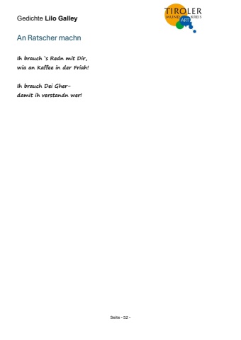Gedichte Lilo Galley Seite - 52 - An Ratscher machn Ih brauch `s Redn mit Dir, wia an Kaffee in der Friah! Ih brauch Dei Gherdamit ih verstandn wer!