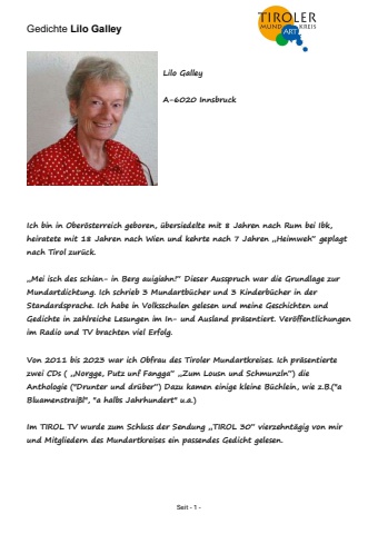 Gedichte Lilo Galley Seit - 1 - Lilo Galley A-6020 Innsbruck Ich bin in Ober%u00f6sterreich geboren, %u00fcbersiedelte mit 8 Jahren nach Rum bei Ibk, heiratete mit 18 Jahren nach Wien und kehrte nach 7 Jahren %u201eHeimweh%u201c geplagt nach Tirol zur%u00fcck. %u201eMei isch des schian- in Berg auigiahn!%u201c Dieser Ausspruch war die Grundlage zur Mundartdichtung. Ich schrieb 3 Mundartb%u00fccher und 3 Kinderb%u00fccher in der Standardsprache. Ich habe in Volksschulen gelesen und meine Geschichten und Gedichte in zahlreiche Lesungen im In- und Ausland pr%u00e4sentiert. Ver%u00f6ffentlichungen im Radio und TV brachten viel Erfolg. Von 2011 bis 2023 war ich Obfrau des Tiroler Mundartkreises. Ich pr%u00e4sentierte zwei CDs ( %u201eNorgge, Putz unf Fangga%u201c %u201eZum Lousn und Schmunzln%u201c) die Anthologie (\Bluamenstrai%u00dfl\Im TIROL TV wurde zum Schluss der Sendung %u201eTIROL 30%u201c vierzehnt%u00e4gig von mir und Mitgliedern des Mundartkreises ein passendes Gedicht gelesen.
