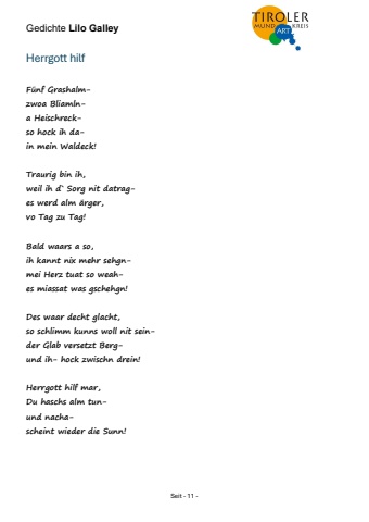 Gedichte Lilo Galley Seit - 11 - Herrgott hilf F%u00fcnf Grashalmzwoa Bliamlna Heischreckso hock ih dain mein Waldeck! Traurig bin ih, weil ih d` Sorg nit datrages werd alm %u00e4rger, vo Tag zu Tag! Bald waars a so, ih kannt nix mehr sehgnmei Herz tuat so weahes miassat was gschehgn! Des waar decht glacht, so schlimm kunns woll nit seinder Glab versetzt Bergund ih- hock zwischn drein! Herrgott hilf mar, Du haschs alm tunund nachascheint wieder die Sunn!
