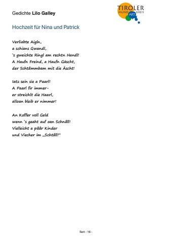 Gedichte Lilo Galley Seit - 16 - Hochzeit f%u00fcr Nina und Patrick Verliabte Aigln, a schians Gwandl, `s gweichte Ringl am rechtn Handl! A Haufn Freind, a Haufn G%u00e4scht, der Scht%u00e2mmbam mit die %u00c4scht! Iatz sein sie a Paarl! A Paarl fir immerer streichlt die Haarl, alloan bleib er nimmer! An Koffer voll Geld wenn `s geaht auf oan Schn%u00e2ll! Vielleicht a p%u00e2%u00e2r Kinder und Viecher im %u201eScht%u00e2ll!%u201c