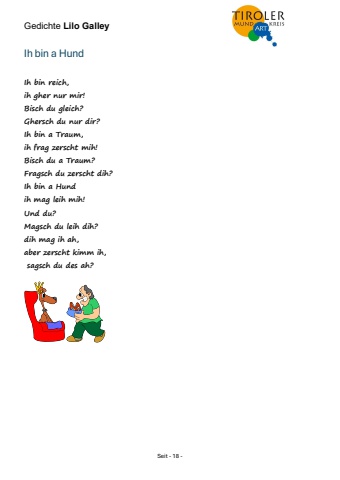 Gedichte Lilo Galley Seit - 18 - Ih bin a Hund Ih bin reich, ih gher nur mir! Bisch du gleich? Ghersch du nur dir? Ih bin a Traum, ih frag zerscht mih! Bisch du a Traum? Fragsch du zerscht dih? Ih bin a Hund ih mag leih mih! Und du? Magsch du leih dih? dih mag ih ah, aber zerscht kimm ih, sagsch du des ah?