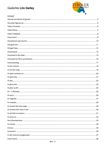 Gedichte Lilo Galley Seit - 2 - Inhalt Gsund und decht nit gsund ........................................................................................................................ 4Gsunder Egoismus .................................................................................................................................... 5Hallo Christine .......................................................................................................................................... 6Hallo Maria ............................................................................................................................................... 7Hallo Teddyb%u00e4r .......................................................................................................................................... 8Haus baun ................................................................................................................................................ 9Hausfreind oder Kuchn ............................................................................................................................ 10Herrgott hilf ............................................................................................................................................. 11Hinige Haxn ............................................................................................................................................. 12Hoamweah ............................................................................................................................................. 13Hochzeit fir die Gabi ................................................................................................................................ 15Hochzeit f%u00fcr Nina und Patrick................................................................................................................... 16Hochzeitstag ........................................................................................................................................... 17Ih bin a Hund ........................................................................................................................................... 18Ih bin Dei Vogl ......................................................................................................................................... 19Ih bleib oanfach so .................................................................................................................................. 20Ih dank Dar .............................................................................................................................................. 21Ih flitz ...................................................................................................................................................... 22Ih gfrei mih .............................................................................................................................................. 23Ih gher zu Dir ........................................................................................................................................... 24Fir `n Michael .......................................................................................................................................... 25Ih kunn .................................................................................................................................................... 26Ih mag Dih ............................................................................................................................................... 27Ih miassts%u2026 ............................................................................................................................................ 28Ih muass Dar was sagn ............................................................................................................................ 29Ih schenk Dar mein Tram ......................................................................................................................... 30Ih will Dih nit valiern ................................................................................................................................. 31Ih wills nit ................................................................................................................................................ 32Ihre Wunderh%u00e4nd .................................................................................................................................... 33Im Dreck ................................................................................................................................................. 34Immer ..................................................................................................................................................... 35Immerhin ................................................................................................................................................ 36In die Truhchn einigschaut ....................................................................................................................... 37Inser Hund .............................................................................................................................................. 38