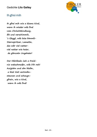 Gedichte Lilo Galley Seit - 23 - Ih gfrei mih Ih gfrei mih wia a kloans Kind, wenn ih wieder w%u00e2s find vom Chrischtkindlzuig, %u00e2lt und verschimmlt, `s Gleggl, w%u00e2s leise bimmltSternspritzer, Lametta, des w%u00e2r viel netterviel netter wia heier, de gl%u00e4nzatn Ungeheier! Der D%u00e2chbodn isch a Freidnix wekschmei%u00dfn, w%u00e2s Dih reit! Auigiahn und obn bleibn, a bissl Zeit vertreibnstaunen und schaugngfrein, wia a Kind, wenn ih w%u00e2s find!