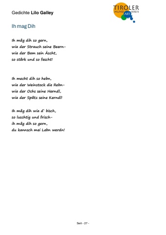 Gedichte Lilo Galley Seit - 27 - Ih mag Dih Ih m%u00e2g dih so gern, wia der Strauch seine Beernwia der Bam sein %u00c4scht, so st%u00e2rk und so fescht! Ih mecht dih so hebn, wia der Weinstock die Rebnwia der Ochs seine Herndl, wia der Sp%u00e2tz seine Kerndl! Ih m%u00e2g dih wia d` bisch, so luschtig und frischih m%u00e2g dih so gern, du kannsch mei Lebn werdn!