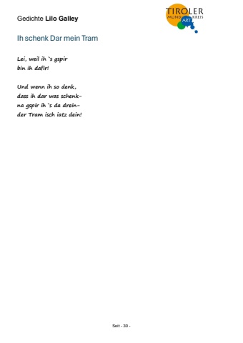 Gedichte Lilo Galley Seit - 30 - Ih schenk Dar mein Tram Lei, weil ih `s gspir bin ih dafir! Und wenn ih so denk, dass ih dar was schenkna gspir ih `s da dreinder Tram isch iatz dein!