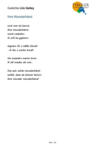 Gedichte Lilo Galley Seit - 33 - Ihre Wunderh%u00e4nd Und wer sie kennt, ihre Wunderh%u00e4ndwerd vastiahnih will sie gspiarn! Gspiarn fir a h%u00e2lbs Stindl- %u2026ih bin a reichs Kindl! Sie massiern meine Kniaih laf wieder als wia%u2026 Des sein echte Wunderh%u00e4ndsch%u00e2d, dass sie koaner kenntihre Wunder Wunderh%u00e4nd!