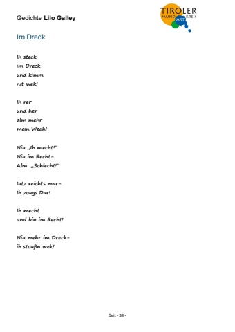 Gedichte Lilo Galley Seit - 34 - Im Dreck Ih steck im Dreck und kimm nit wek! Ih rer und her alm mehr mein Weah! Nia %u201eIh mecht!%u201c Nia im RechtAlm: %u201eSchlecht!%u201c Iatz reichts marIh zoags Dar! Ih mecht und bin im Recht! Nia mehr im Dreckih stoa%u00dfn wek!