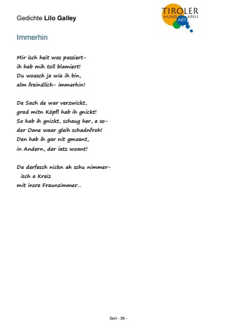 Gedichte Lilo Galley Seit - 36 - Immerhin Mir isch heit was passiertih hab mih toll blamiert! Du woasch ja wia ih bin, alm freindlich- immerhin! De Sach de war verzwickt, grad mitn K%u00f6pfl hab ih gnickt! So hab ih gnickt, schaug her, a soder Oane waar gleih schadnfroh! Den hab ih gar nit gmoant, in Andern, der iatz woant! Da derfesch nickn ah schu nimmer- isch a Kreiz mit insre Fraunzimmer%u2026