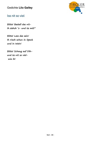 Gedichte Lilo Galley Seit - 39 - Iss nit so viel Bitte! Bestell des nitih siehch `s- und iss mit!%u201c Bitte! Lass des sein! Ih riach schun in Speck und in Wein! Bitte! Schaug auf Dihund iss nit so viel- wia ih!