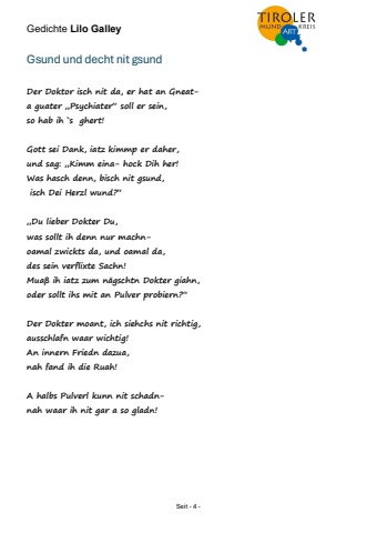 Gedichte Lilo Galley Seit - 4 - Gsund und decht nit gsund Der Doktor isch nit da, er hat an Gneata guater %u201ePsychiater%u201c soll er sein, so hab ih `s ghert! Gott sei Dank, iatz kimmp er daher, und sag: %u201eKimm eina- hock Dih her! Was hasch denn, bisch nit gsund, isch Dei Herzl wund?%u201c %u201eDu lieber Dokter Du, was sollt ih denn nur machnoamal zwickts da, und oamal da, des sein verflixte Sachn! Mua%u00df ih iatz zum n%u00e4gschtn Dokter giahn, oder sollt ihs mit an Pulver probiern?%u201c Der Dokter moant, ich siehchs nit richtig, ausschlafn waar wichtig! An innern Friedn dazua, nah fand ih die Ruah! A halbs Pulverl kunn nit schadnnah waar ih nit gar a so gladn!