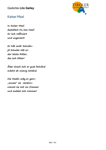 Gedichte Lilo Galley Seit - 42 - Kaiser Maxl In Kaiser Maxl dastellsch Du koa Haxl! Er isch raffiniert und ungeniert! Er h%u00e2t zw%u00e2r Schuldnj%u00e2 Schuldn h%u00e2t erder letzte Ritter, des isch bitter! %u00c2ber sinsch isch er guat bein%u00e2nd m%u00e2cht ah wianig Sch%u00e2nd. Die Madln m%u00e2g er gern- %u201emuass%u201c sie verehrnnimmt sie mit ins Zimmer und meldet sich nimmer!