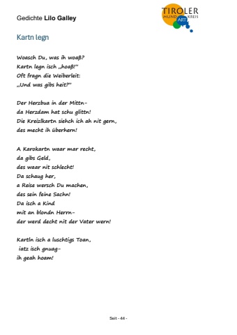 Gedichte Lilo Galley Seit - 44 - Kartn legn Woasch Du, was ih woa%u00df? Kartn legn isch %u201ehoa%u00df!%u201c Oft fragn die Weiberleit: %u201eUnd was gibs heit?%u201c Der Herzbua in der Mittnda Herzdam hat schu glittn! Die Kreizlkartn siehch ich ah nit gern, des mecht ih %u00fcberhern! A Karokartn waar mar recht, da gibs Geld, des waar nit schlecht! Da schaug her, a Reise wersch Du machen, des sein feine Sachn! Da isch a Kind mit an blondn Herrnder werd decht nit der Vater wern! Kartln isch a luschtigs Toan, iatz isch gnuagih geah hoam!