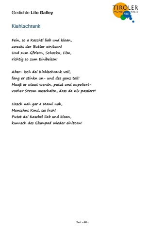 Gedichte Lilo Galley Seit - 46 - Kiahlschrank Fein, so a Kaschtl liab und kloan, zwecks der Butter einitoan! Und zum Gfriern, Schockn, Eisn, richtig so zum Einibeissn! Aber- isch dei Kiahlschrank voll, fang er stinkn un- und des ganz toll! Mua%u00df er otaut werdn, putzt und aupoliertvorher Strom ausschaltn, dass da nix passiert! Hasch nah gar a Mami noh, Menschns Kind, sei froh! Putzt dei Kaschtl liab und kloan, kunnsch des Glumpad wieder einitoan!