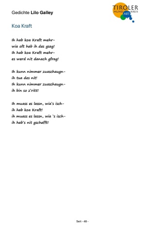 Gedichte Lilo Galley Seit - 48 - Koa Kraft Ih hab koa Kraft mehrwia oft hab ih des gsag! Ih hab koa Kraft mehres werd nit danach gfrag! Ih kunn nimmer zuaschaugnih tua des nit! Ih kunn nimmer zuaschaugnih bin so z`ritt! Ih muass es lassn, wia`s ischih hab koa Kraft! ih muass es lassn, wia `s ischih hab`s nit gschafft!