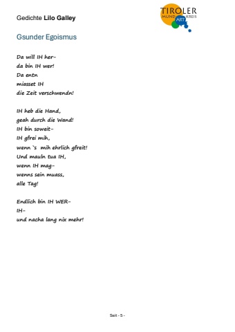 Gedichte Lilo Galley Seit - 5 - Gsunder Egoismus Da will IH herda bin IH wer! Da entn miasset IH die Zeit verschwendn! IH heb die Hand, geah durch die Wand! IH bin soweitIH gfrei mih, wenn `s mih ehrlich gfreit! Und mauln tua IH, wenn IH magwenns sein muass, alle Tag! Endlich bin IH WERIHund nacha lang nix mehr!