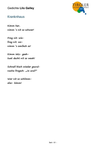 Gedichte Lilo Galley Seit - 51 - Kranknhaus Kimm her, nimm `s nit so schwer! Frag nit: wiafrag nit: wonimm `s oanfach so! Kimm iatz- geahtuat decht nit so weah! Schnell bisch wieder gsundnacha fragsch: %u201eJa und?%u201c War nit so schlimmalso- kimm!