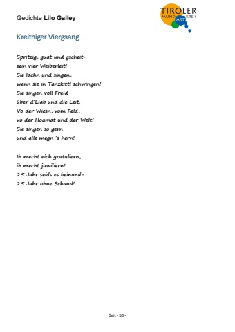 Gedichte Lilo Galley Seit - 53 - Kreithiger Viergsang Spritzig, guat und gscheitsein vier Weiberleit! Sie lachn und singen, wenn sie in Tanzkittl schwingen! Sie singen voll Freid %u00fcber d`Liab und die Leit. Vo der Wiesn, vom Feld, vo der Hoamat und der Welt! Sie singen so gern und alle megn `s hern! Ih mecht eich gratuliern, ih mecht juwiliern! 25 Jahr seids es beinand25 Jahr ohne Schand!