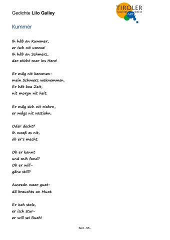 Gedichte Lilo Galley Seit - 55 - Kummer Ih h%u00e2b an Kummer, er isch nit umma! Ih h%u00e2b an Schmerz, der sticht mar ins Herz! Er m%u00e2g nit kemmenmein Schmerz weknemmen. Er h%u00e2t koa Zeit, nit morgn nit heit. Er m%u00e2g sich nit riahrn, er m%u00e2gs nit vastiahn. Oder decht? Ih woa%u00df es nit, ob er`s mecht. Ob er kannt und mih fand? Ob er willg%u00e2nz still? Ausredn waar guatd%u00e2 brauchts an Muat. Er isch stolz, er isch sturer will sei Ruah!
