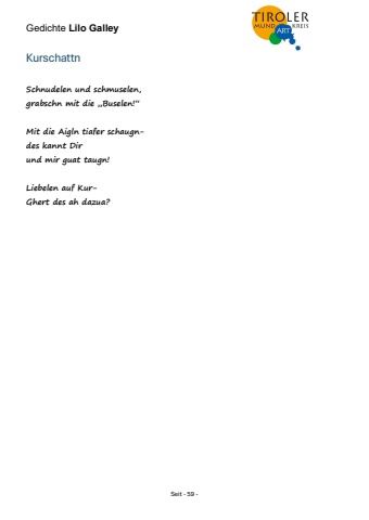 Gedichte Lilo Galley Seit - 59 - Kurschattn Schnudelen und schmuselen, grabschn mit die %u201eBuselen!%u201c Mit die Aigln tiafer schaugndes kannt Dir und mir guat taugn! Liebelen auf KurGhert des ah dazua?