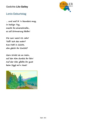 Gedichte Lilo Galley Seit - 62 - Lenis Geburtstag %u2026 und weil ih `n bsunders mag, in heitign Tag, mecht ihs einerschreibn, es soll Erinnerung bleibn! Die Leni werd 42 Jahr! Teifl! Isch des wahr? Koa Faltl in Gsicht, alm gleich ihr Gwicht? Gern trinkt sie an Wein, auf der Alm dunkts ihr fein! Auf der Alm gfallts ihr guat beim Siggl mi`n Huat!