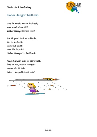 Gedichte Lilo Galley Seit - 63 - Liaber Herrgott beitl mih Was ih mach, mach ih falsch; was woa%u00df denn ih!? Liaber Herrgott beitl mih! Bin ih guat, isch es schlecht, bin ih schlecht, isch`s nit guat; wer bin iatz ih? Liaber Herrgott... beitl mih! Frag ih z`viel, wer ih gschimpft, frag ih nix, wer ih gimpftdrum bitt ih Dih: liaber Herrgott; beitl mih!