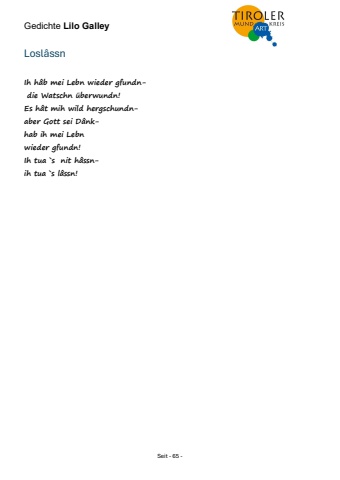 Gedichte Lilo Galley Seit - 65 - Losl%u00e2ssn Ih h%u00e2b mei Lebn wieder gfundn- die Watschn %u00fcberwundn! Es h%u00e2t mih wild hergschundnaber Gott sei D%u00e2nkhab ih mei Lebn wieder gfundn! Ih tua `s nit h%u00e2ssnih tua `s l%u00e2ssn!