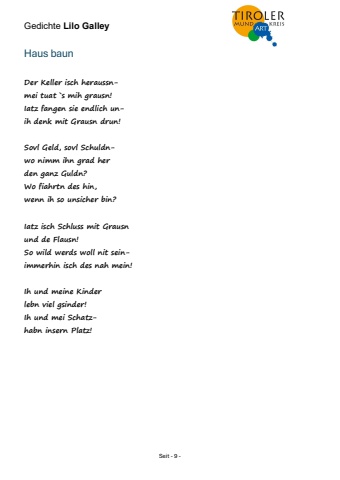 Gedichte Lilo Galley Seit - 9 - Haus baun Der Keller isch heraussnmei tuat `s mih grausn! Iatz fangen sie endlich unih denk mit Grausn drun! Sovl Geld, sovl Schuldnwo nimm ihn grad her den ganz Guldn? Wo fiahrtn des hin, wenn ih so unsicher bin? Iatz isch Schluss mit Grausn und de Flausn! So wild werds woll nit seinimmerhin isch des nah mein! Ih und meine Kinder lebn viel gsinder! Ih und mei Schatzhabn insern Platz!