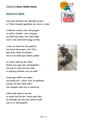 Gedichte Karin Ulrike Heiss Seite - 37 - Hansl im GlickNach dem M%u00e4rchen der Gebr%u00fcder Grimm In Tiroler Mundart gedichtet von Karin U. Heiss A Bursche nomens Hons isch gongen, er wollt a Tischler- Lehr unfongen. Als Gsell noch siebn Johr voller Flei%u00df hod er vom Chef Gold kriagg as Preis. %u201eHons, du hosch ma treu gedient, iatz kusch hoam gean, weil i find, dass deine Oldies di vamissn, loss ma sie decht gonz schean grie%u00dfn! Im Gortn au%u00dfn bei der Heckn findsch zum gean dein Wondasteckn.%u201c Iatz isch er zochn mit sein Gold in Richtung Hoamat, wia ers wollt. Unterwegs trifft er an Reiter, und denkt sich: %u201eHansl, wars nit gscheiter, z`hockn auf dem edlen Ross?%u201c Den Klumpm Gold wor er schnell los. Voller Stolz hockt er do obn, er mecht sich f%u00fcr den Tausch grod lobn, do schmei%u00dft der Gaul den ormen Knobn ochi in an Strossngrobn.