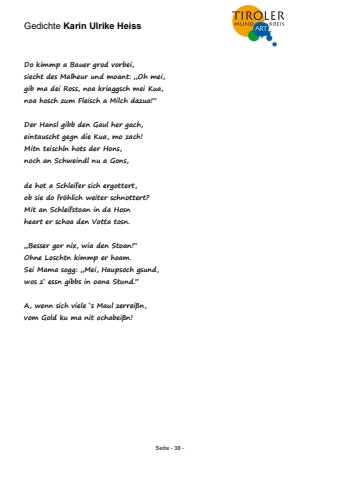 Gedichte Karin Ulrike Heiss Seite - 38 - Do kimmp a Bauer grod vorbei, siecht des Malheur und moant: %u201eOh mei, gib ma dei Ross, noa kriaggsch mei Kua, noa hosch zum Fleisch a Milch dazua!%u201c Der Hansl gibb den Gaul her gach, eintauscht gegn die Kua, mo zach! Mitn teischln hots der Hons, noch an Schweindl nu a Gons, de hot a Schleifer sich ergottert, ob sie do fr%u00f6hlich weiter schnottert? Mit an Schleifstoan in da Hosn heart er schoa den Votta tosn. %u201eBesser gor nix, wia den Stoan!%u201c Ohne Loschtn kimmp er hoam. Sei Mama sogg: %u201eMei, Haupsoch gsund, wos z` essn gibbs in oana Stund.%u201c A, wenn sich viele `s Maul zerrei%u00dfn, vom Gold ku ma nit ochabei%u00dfn!
