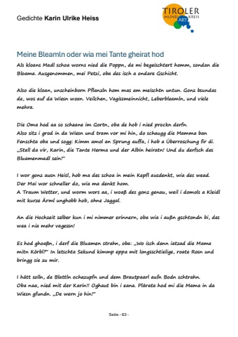 Gedichte Karin Ulrike Heiss Seite - 63 - Meine Bleamln oder wia mei Tante gheirat hod Als kloans Madl schoa worns nied die Poppn, de mi begeischtert homm, sondan die Bloama. Ausgenommen, mei Petzi, oba des isch a ondare Gschicht. Also die kloan, unscheinborn Pflanzln hom mas am meischtn untun. Gonz bsundas de, wos auf da Wiesn woxn. Veilchen, Vagissmeinnicht, Leberbleamln, und viele mehra. Die Oma hod aa so scheane im Gortn, oba de hob i nied prockn derfn. Also sitz i grod in da Wiesn und tram vor mi hin, do schaugg die Mamma ban Fenschta oba und sogg: Kimm amol an Sprung auffa, i hob a %u00dcberroschung fir di. %u201eStell da vir, Karin, die Tante Herma und der Albin heiratn! Und du derfsch des Bluamenmadl sein!%u201c I wor gonz ausn Heisl, hob ma des schoa in mein Kepfl ausdenkt, wia des wead. Der Mai wor schneller do, wia ma denkt hom. A Traum Wetter, und worm wors aa, i woa%u00df des gonz genau, weil i domols a Kleidl mit kurze %u00c4rml unghobb hob, ohne Jaggal. An die Hochzeit selber kun i mi nimmer erinnern, oba wia i au%u00dfn gschtondn bi, des wea i nia mehr vagessn! Es hod ghoa%u00dfn, i derf die Bluamen strahn, oba: %u201eWo isch denn iatzad die Mama mitn K%u00f6rbl?%u201c In letschta Sekund kimmp eppa mit longsschtielige, roate Rosn und bringg sie zu mir. I h%u00e4tt solln, de Blattln ochazupfn und dem Brautpaarl aufn Bodn schtrahn. Oba naa, nied mit der Karin!! Oghaut bin i eana. Pl%u00e4rata hod mi die Mama in da Wiesn gfundn. %u201eDe wern jo hin!%u201c