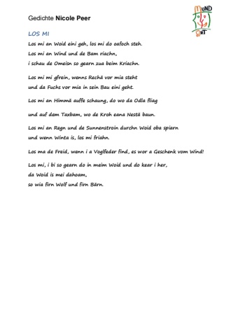 Gedichte Nicole Peer LOS MI Los mi an Woid eini geh, los mi do oafoch steh. Los mi an Wind und de Bam riachn, i schau de Omeisn so gearn zua beim Kriachn. Los mi mi gfrein, wenns Rech%u00e4 vor mia steht und da Fuchs vor mia in sein Bau eini geht. Los mi an Himm%u00e4 auffe schaung, do wo da Odla fliag und auf dem Taxbam, wo de Kroh eana Nest%u00e4 baun. Los mi an Regn und de Sunnenstroin durchn Woid oba spiarn und wenn Winta is, los mi friahn. Los ma de Freid, wenn i a Voglfeder find, es wor a Geschenk vom Wind! Los mi, i bi so gearn do in meim Woid und do kear i her, da Woid is mei dahoam, so wia firn Wolf und firn B%u00e4rn.