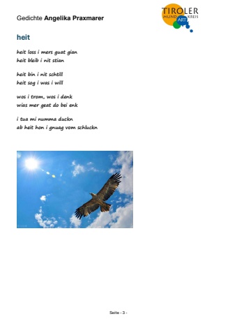 Gedichte Angelika Praxmarer Seite - 3 - heit heit loss i mers guat gian heit bleib i nit stian heit bin i nit schtill heit sog i was i will wos i trom, wos i denk wias mer geat do bei enk i tua mi numma duckn ab heit hon i gnuag vom schluckn