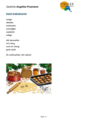 Gedichte Angelika Praxmarer Seite - 4 - beim keksbochn owegn obreslen oschmeckn auswalglen ausstechn aulegn alls derwochtn nit z%u00b4long und nit wienig grod recht bis weihnachten isch advent
