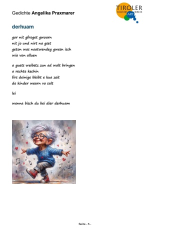 Gedichte Angelika Praxmarer Seite - 5 - derhuam gor nit gfroget gwoarn nit jo und nirt na gset geton was noatwendeg gwesn isch wia von alluen a guets weibetz zun ad walt bringen a rechte kechin firs deinige bleibt e kua zeit de kinder wearn vo salt lei wenna bisch du bei dier derhuam