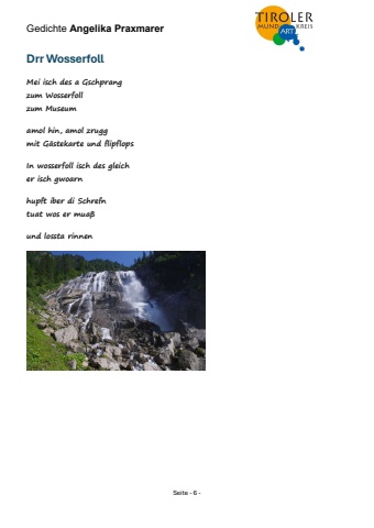 Gedichte Angelika Praxmarer Seite - 6 - Drr Wosserfoll Mei isch des a Gschprang zum Wosserfoll zum Museum amol hin, amol zrugg mit G%u00e4stekarte und flipflops In wosserfoll isch des gleich er isch gwoarn hupft iber di Schrefn tuat wos er mua%u00df und lossta rinnen