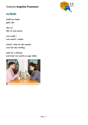 Gedichte Angelika Praxmarer Seite - 7 - zu Redn Stoff zun Redn geits alm iber mi iber di und duane wos woa%u00df i wos mecht i wissen mecht i dass du des woasch und isch des wichteg oder lei a virhong weil mier ins nuicht zu sogn hobm