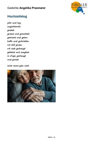 Gedichte Angelika Praxmarer Seite - 8 - Hochzeitstog johr und tog augschtondn gredet gramt und groschtet getromt und geton kolfn und gschriebm nit still gwesn nit wek gschaugt gebetet und zuaglost in d%u2019ogn gschaugt und gwisst miar zwoa gien weit